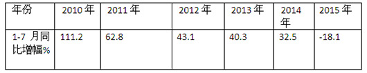 2010年1-7月---2015年1-7月大中客出口同比增幅统计表%