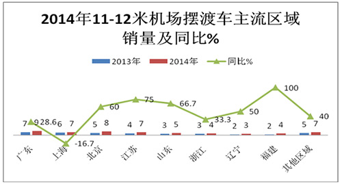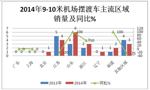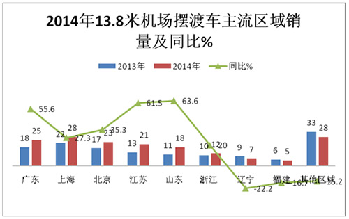 1、2014年及2013年按长度划分机场摆渡车主要区域流向分布比较表(辆,%)