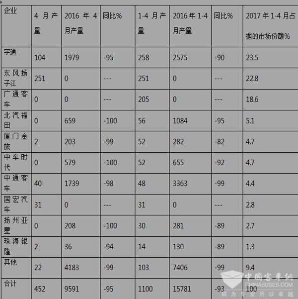 二、主流纯电动客车企业2017年4月及1-4月纯电动客车产量及占据份额分析: