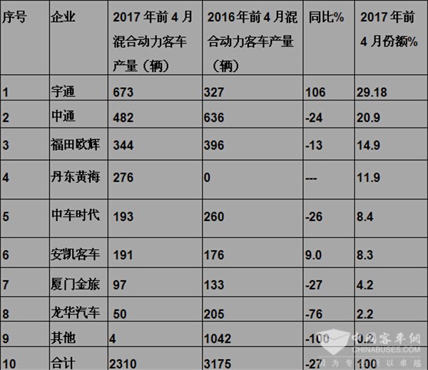根据工信部合格证发放数量统计,2017年前4月主流客车混合动力表:客车产量如下