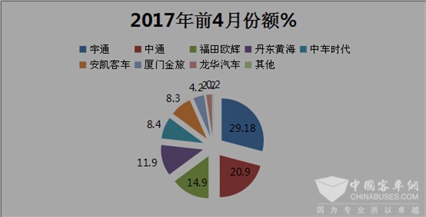 2、从市场竞争格局来看,跟往年不同的是,2017年插电式混合动力客车市场的主角由十几家变成了几家。上表显示,2017年前4月,该细分市场的车企只有五家,可以说是八强瓜分了所有市场“蛋糕”。其中,宇通客车排在第一,占据了近30%的份额。
