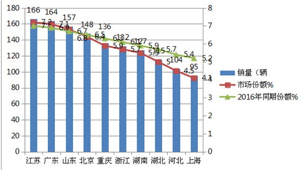 上图表表明,2017年前4月混合动力客车重点流向江苏、广东、山东等10个重点区域市场,前3个区域市场市场集中度提高了,而前10个重点区域混合动力客车的市场占有率为58.2%,同比2016年下降了近3.5个百分点,说明重点区域的垄断程度有所减弱。