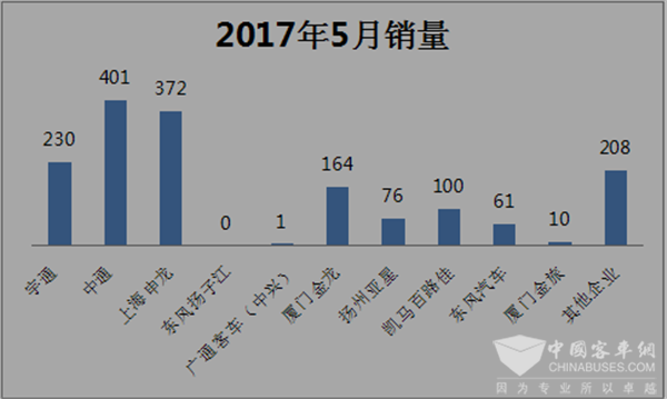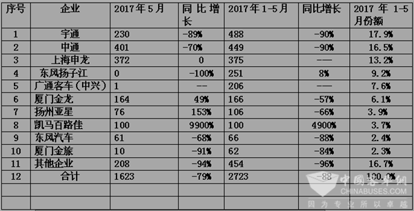 2017年1-5月前10名纯电动客车产量一览(单位:辆)