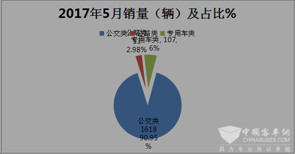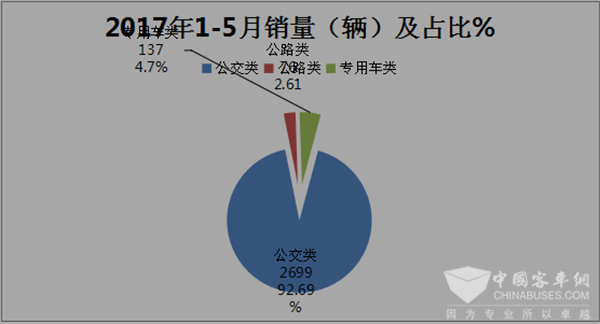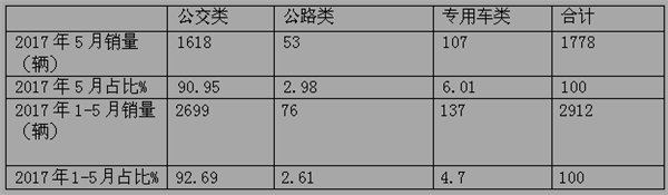根据最新上牌信息统计,2017年5月上牌纯电动客车数量为1779辆,其中公交类纯电动客车占据近91%的市场权重,公路客车3%,专用客车为近6%,1-5月纯电动客车累计上牌数量为2912辆,具体如下表: