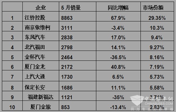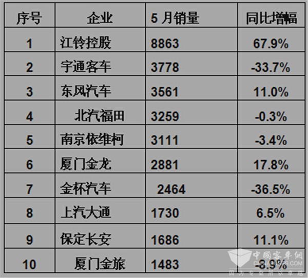 1、 5月前10名主流客车企业中,江铃控股销量最大。增幅最大,主要是江铃轻客给力所致。