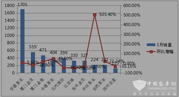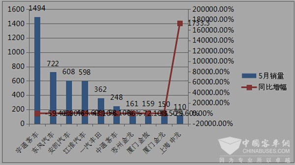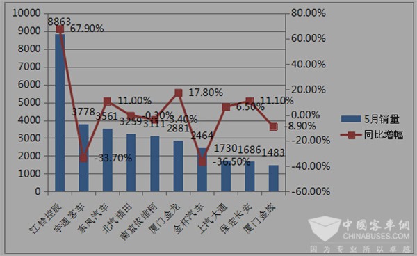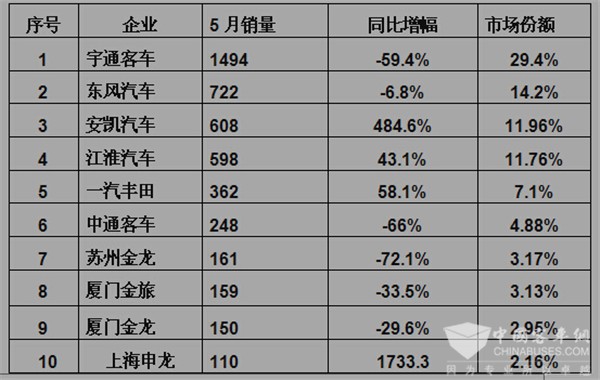 一、2017年5月客车行业销售前10名企业销量情况分析---5家增长,5家下降,几家欢喜家愁。