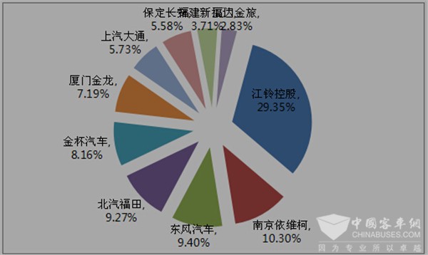 2、 其他两龙—大金龙和小金龙分别处于第二和第三,两龙加在一起的份额只有20.9%,也远远不及宇通,而另外一龙——苏州金龙大客的份额只有6.44%,屈居第七,表现不佳。