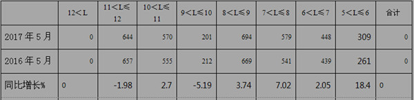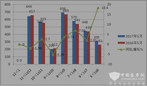 特点二、10-12米大型旅游客车呈现负增长;7-9米中型旅游客车呈现正增长;5-7米轻型客车呈现正增长,其中5-6米增幅最大---按长度段划分,2017年5月旅游客车销量分析。