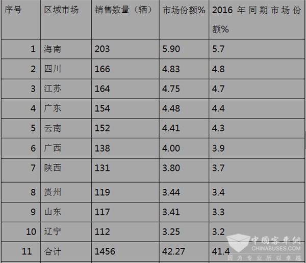 1、2017年 5月在全国销量位于前10名旅游客车市场的海南、四川、江苏、广东、云南、广西、陕西、贵州、山东、辽宁等10个区域市场中,共销售了1456辆旅游客车,占据了42.27%的市场份额。这说明旅游客车市场不可能象高档客车那样集中度那么高,相反,旅游客车市场的集中度不高说明全国的各个市场对旅游客车来说都有机会,这也进一步证明了旅游客车产品为什么每个客车厂家都有销售,每个区域市场都能看到旅游客车在运营的主要原因了。