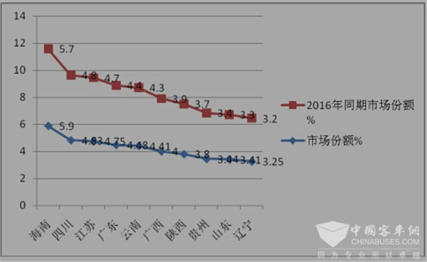 2、在前10个旅游市场中,海南是市场份额最大的旅游区域市场,主要因为该区域有三亚等著名的旅游休假城市,而且海南国际最大的旅游岛屿,市场份额同比提高了0.2个百分点,也是前10名区域中增幅最大的市场;四川是市场份额次大的旅游市场,主要是因为有著名的“九寨沟”、都江堰和青城山、峨眉山等景点所致。但市场份额比2016年同期增长了0.03个百分点,是主要区域市场中上升幅度较大的,这主要是因为四川区域在08年上半年发生了大地震,那里的道路和经济状况都受到了重大的影响,对旅游客车市场也有明显的影响 ,而后来若干年各个旅游景点基本完全恢复,因此增长相对较大。 3、其次是江苏区域,是旅游客车销量第三大的区域,那里也是我国著名的旅游胜地不仅有六朝古都南京,还有无锡著名的三国城和苏州园林、苏北连云港的花果山等旅游胜地,旅游客车的市场份额2017年5月也增长了0.05个百分点,增幅相对较小。
