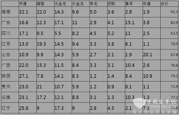 2、 在上述所列的10个主流区域市场中,作为第一旅游大市场的海南,垄断程度最高,旅游客车市场竞争最不充分,其中宇通市场份额接近三分之一,海格客车市场份额接近四分之一,大小金龙的市场份额也不低,可以说,海南旅游客车市场基本是三龙一通的天下。