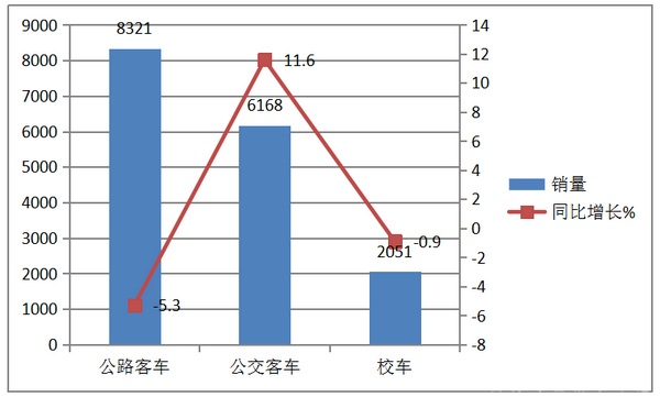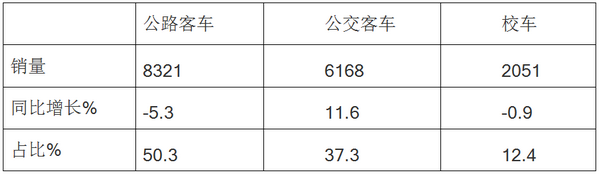 2017年7月,5米以上客车产品单月销量16541辆,同比增长1.0%,实现本年度首次正向增长。本月,公路车是客车行业的主力产品,单月销售8321辆,同比增长-5.3%,占行业总量的50.3%。公交车:单月销售6168辆,实现同比增长11.6%,占据客车市场的权重为37.3%,校车:单月销售2052,增长-0.9%,占据当月客车市场的权重为12.4%。