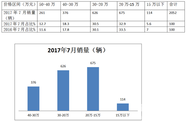 3、2017年7月15万以下的价格区间销量占比减少,主要是因为2017年7月3.5-5米之间的校车市场减少,因此拉高了在这一区间的价格。