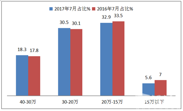 二、15万—30万之间的价格车型销量占比最多----按价格细分市场划分,对2017年7月校车销量结构进行分析
