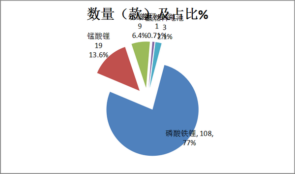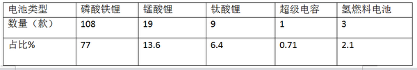 二、搭载磷酸铁锂电池的有108款,占比77%;搭载锰酸锂的有19款,占比13.6%;搭载钛酸锂的有9款,占比6.4%;搭载超级电容的1款,占比0.71%;搭载氢燃料电池的有3款,占比2.1%。(个别车型可选配两种电池,故统计的数量超过车型款数)---对第8批新能源客车推荐目录车型搭载电池类数量及占比分析
