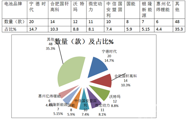 数量排名前十位的是:宁德时代、合肥国轩高科、深圳市沃特玛、微宏动力、中信国安盟固利、北京国能电池、银隆新能源、惠州亿纬锂能、江苏春兰清洁能源、江苏海四达电源。(6款车型未查询到详细的电池企业信息。个别车型选配两个企业的电池产品,故统计的数量超过车型款数。)