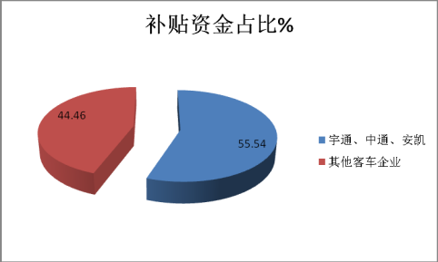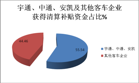 上图表数据表明,宇通、中通、安凯等优势新能源客车企业在本次补贴清算中获得了89.96亿元的资金补贴,而行业内其他新能源客车企业共计获得的清算补贴资金只有大约72亿元,也就是说,宇通、中通、安凯三家龙头客车企业获得的资金补贴占据客车行业的55.54%的权重份额。