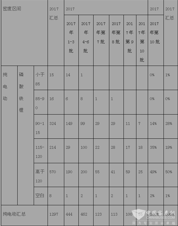 2017年1-10批新能源客车推荐目录中的纯电动客车电池能量密度特征统计表
