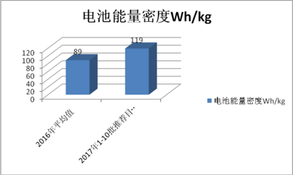 1、从市场来看,新能源客车的动力电池能量密度提升较为明显,2016年电池系统能量密度平均值为89Wh/kg,2017年1-10月提高到119Wh/kg。通过对第6、7、9、10批推荐目录梳理,笔者发现低端电池(能量密度低于85Wh/kg)的产品基本退出了市场。