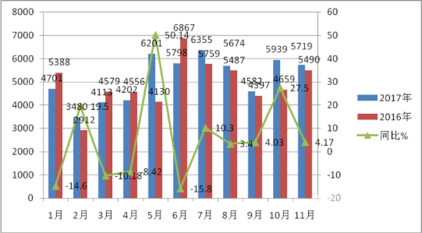 2、2017年1-11月中,同比有7个月增长,4个月下降。其中增长最大的月份是5月,增幅超过50%,下降最大的月份是6月,11月份增幅处于稳中有升态势。.
