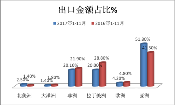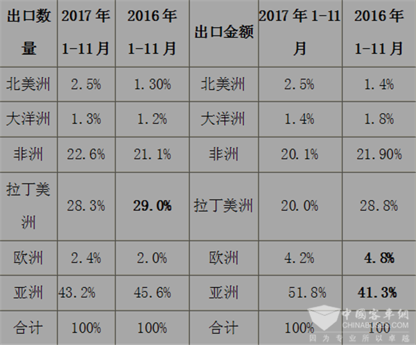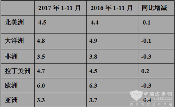 1、上图表数据表明,2017年1-11月我国客车出口主要集中在亚洲、拉丁美洲和非洲,这三个大洲出口数量占比为94.1%,但同比2016年的95.7%却下降了1.6个百分点,说明我国客车出口市场已经有向欧洲、大洋洲等发达国家渗透的迹象,这个迹象虽然太明显,但说明中国客车出口逐步走向全球。