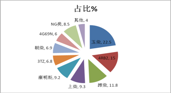 2、 汽油类中,绵阳4RB2机器占比最大,其次是重型汽油机3TZ,再次是三菱发动机4G69N.
