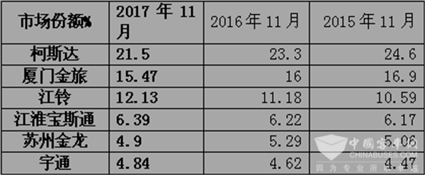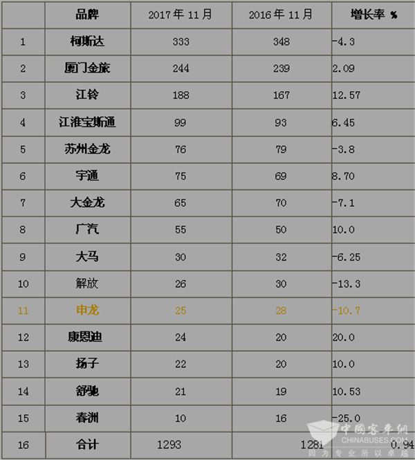 2017年11月各主流考斯特品牌销量及同比统计表(来自上牌数据)