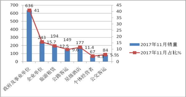 按照目标市场用途划分,2017年11月各细分市场的销量及市场份额如下表: