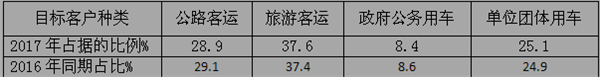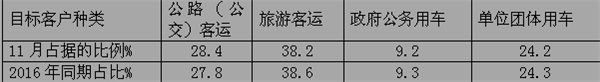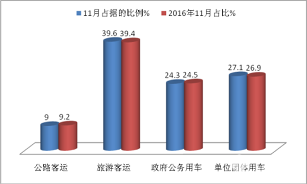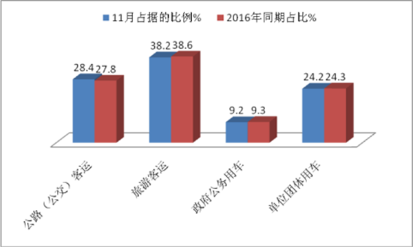 丰田考斯特2017年11月最大的目标客户群体是旅游客运,且同比上升;其次是团体用车,且同比上升,再次是政府公务用车,且同比下降,最小的是公路客运且同比微降。