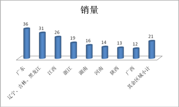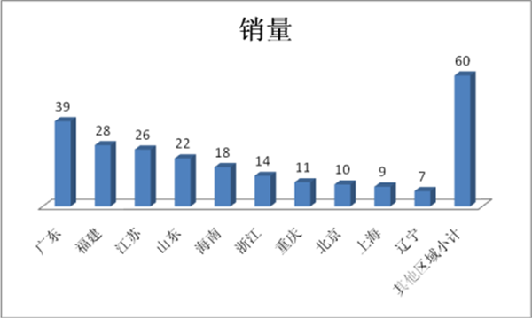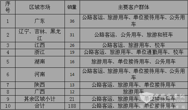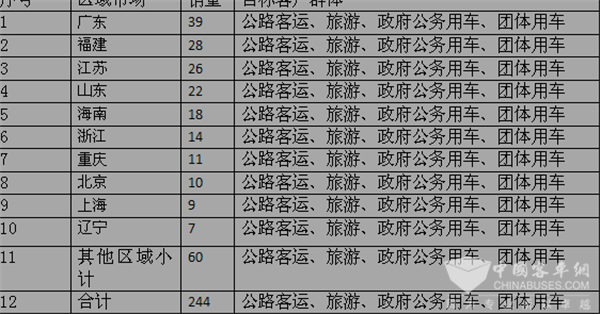 评析:广东、福建、江苏、山东和海南是小金龙考斯特客车销量最大的前5个区域市场。
