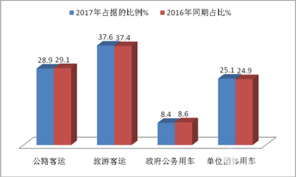 2017年11月份,国产品牌中最大销量的小金龙考斯特,主要细分市场用于旅游客运领域,且同比处于下降趋势,公路公交客运领域其次,但同比有一定增长,再次是单位团体客车领域,且同比下降了0.1个百分点;政府公务用车领域为最少,且同比下降,主要原因是三公费用得到了限制,公款旅游市场受到了制约。