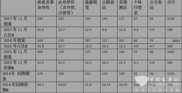 2、按目标客户群体划分分析2017年11月小金龙考斯特销量结构