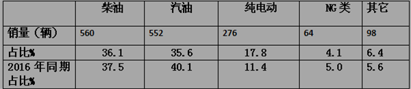 根据最新上牌数据信息,2017年11月份累计销售1550辆考斯特客车,按动力种类划分统计如下表: