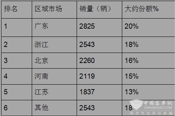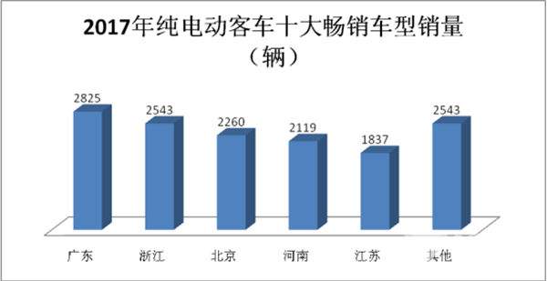上述统计数据表明,2017年销量前10名的纯电动客车车型主要流向广东、浙江、北京、河南、江苏等5个主要市场,这5个市场的累计占有率达到82%,全国其余区域只有18%的市场机会,进一步说明纯电动客车市场的不均衡性,这也给其他新能源客车企业在市场营销的区域定位、营销策略的制定及资源的投入上提供了一些量化的市场依据。