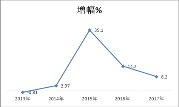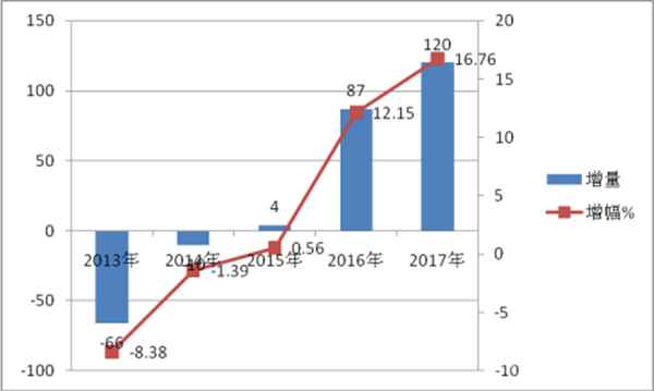 1) 2013年1—12月份到2017年1-12月份,对价格在90万-150万之间的销售情况分析可知,此区间的客车销售每年份都呈现上升趋势,2015年同比销量增幅在5年中处于最大。2016年次之。近5年来价格在90-150万区间客车销量增长和增幅情况(表4)