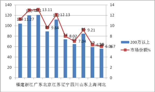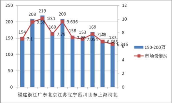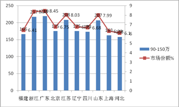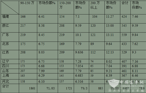 福建、浙江、广东、北京、江苏等10个区域市场是90万以上高档客车市场需求的主要市场,集中度比较高。需求比例占整个高档客车市场的78.6%(2016年同期为79%),比2016年同期降低了0.4个百分点;其他区域市场销售高端客车只有近21.4%的市场机会。在90-150万的价格区间,集中度为71.83%,150-200万的价格区间的集中度为79.3%;200万以上的集中最高度为95.88%,也就是说,90万以上高档客车在200万以上区间集中度最高,90-150万集中度最低,即随着价格的升高,集中度也在升高,集中度与价格成正比。