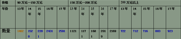 按价格区间划分统计2013年1-12月至2017年1-12月高档豪华客车销售数据(表3),单位:辆