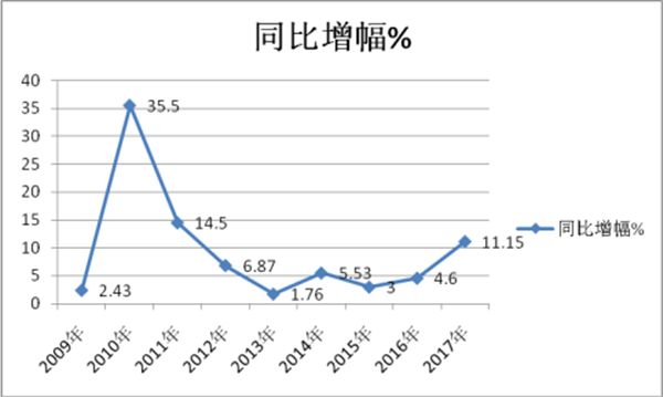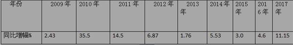 下表是2009年-2017年旅游客车市场的增幅%表