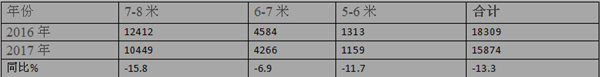 2、2017年城乡公交在各长度段销量同比均处于下降状态。总体同比下降13.3%,且7-8米下降幅度最大,为15.8%