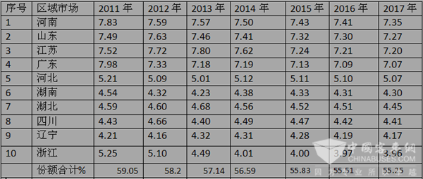 2、销量前10名主流区域市场的城乡公交车销量的市场份额各自规律不尽相同,其中河南和浙江市场份额在逐年下降,其余省份则呈现出不同的状况,无一定规律可循。