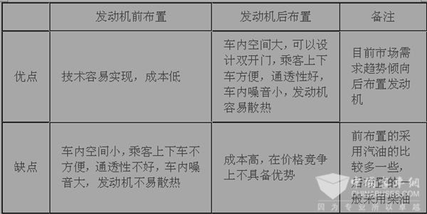 2、城乡公交车辆对发动机的布置要求。目前一般7~8米公交车发动机布置的方式有两种:有采取前布置的,也有采取后布置的。前布置与后布置各有优缺点,主要分析如下表: