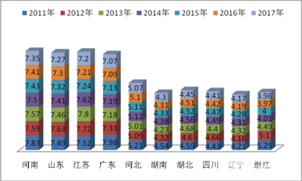 1、人口大省河南、四川、湖南、河北、湖北及经济大省江苏、广东、山东、辽宁、浙江等10个区域的城乡公交市场占有率超过了全国城乡公交总市场的半壁江山,2017前占有率为55.25%,是近7年中最低的,其余年份都接近60%,说明到了2017年城乡公交车的区域垄断程度明显下降,其他非重点区域市场的市场机会在加大,从另外一方面也说明,中国农村经济发展的地区差异正随着城乡一体化进程的推进在逐步缩小。