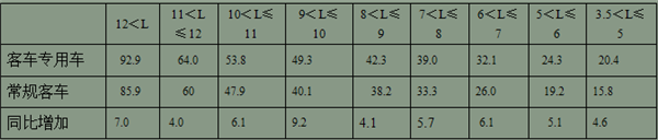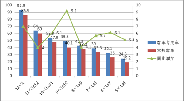从上图表可以看出:客车专用车单辆平均售价全部在相应区段的常规客车之上。相差的最大比例是9-10米,高出常规车型达9.2万元,其次是大于12米高出常规车型达到7.0万。