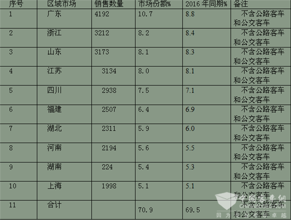 第三、前10名市场的集中度 比去年同期提高1.4个百分点,且广东份额增加最多。而江苏、山东、浙江等重点区域的市场份额比2016年同期均有所降低。