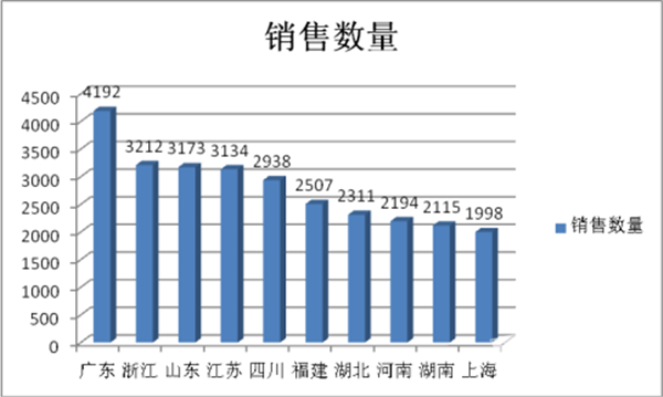 分析:第一、客车专用车销售的前10名主要是广东、浙江、山东、江苏、四川、福建等区域。最大的是广东市场,占有的市场份额为10.7. 第二、广东等前10名区域市场的集中度为70.9,垄断程度较高,全国其他23个区域(省、直辖市、自治区)只占有30%不到的市场份额,说明客车专用车的市场分布式相当不均衡的,这给客车专用车制造企业制定营销策略和投放营销资源提供了有利的市场依据。
