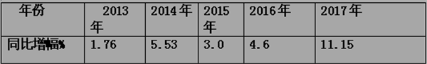 1、 近5年中,2017年同比增幅最大,首次出现增幅达到两位数。