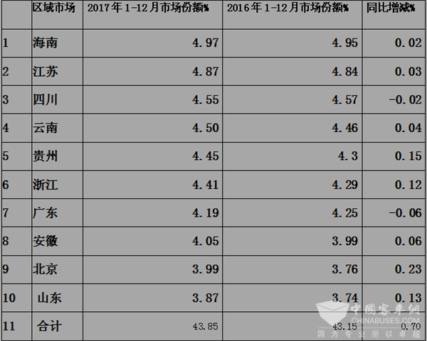 下表是2017年1-12月全国重点10区域旅游客车市场份额%统计分析,表3