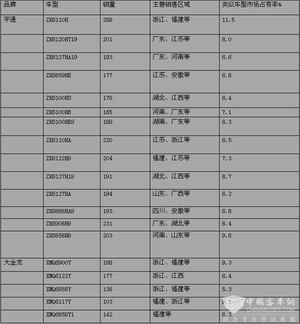 2、大金龙旅游车型仅次于宇通,处于第二,车型长度覆盖8米-12米,明星车型达6款,占据了17%的市场份额,重点市场在福建、浙江等区域,销量最多的是XMQ6900Y,此款中型车表现最为突出,销量近188辆,规模效应渐现。