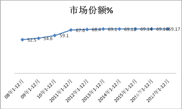 从上图表可以看出:三龙两通及青年、安凯等7家主流企业的旅游客车的市场占有率从08年的52.5%逐年升高到2017年的69.17%,说明在客车行业旅游客车市场的客户一方面越来越注重品牌,另外一方面,旅游客车市场的垄断程度越来越高,而且有加大的发展态势,留给其他客车企业的旅游市场机会越来越少,但增速有回落的态势(从曲线上看,曲线斜率逐渐减小)。
