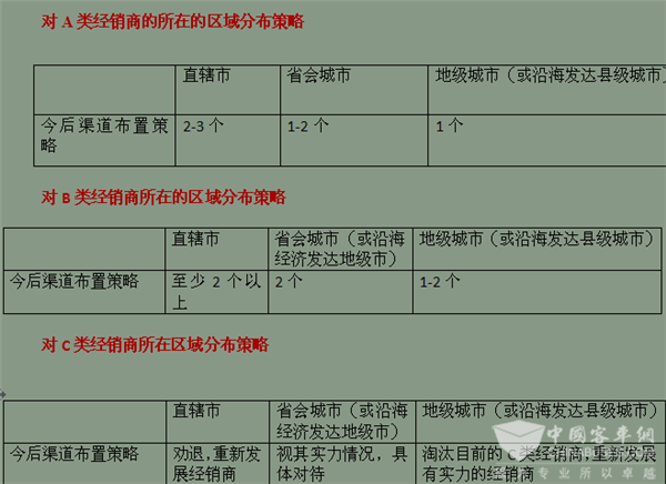 总体策略:目前宜集中优势兵力强攻区域市场。新能源商务客车企业汽车目前在汽车行业还只是个中小品牌,在营销渠道上,还必须依托强势经销商的支持,同时由于资源有限,目前不可能也没有必要在全国范围内面面俱到的建立营销渠道,展开大规模的市场促销活动。集中优势兵力,在局部重点市场和省会城市开展轰轰烈烈的市场建设活动和促销活动,在这样的局部市场,逐步奠定新能源商务客车企业的品牌和影响力,让其他同行的大品牌也难以在短时期内威胁其在该地的市场地位做强。渠道布置建议如下: